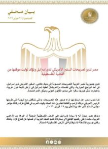 كما تعرب مصر عن استغرابها إزاء صدور هذه التصريحات، والتي تتناقض مع الرؤية التي طرحها الرئيس الأمريكي دونالد ترامب والنقاط العشرين ذات الصلة بإنهاء الحرب في قطاع غزة، وكذلك مؤتمر مجلس السلام الذى عقد بواشنطن يوم ١٩ فبراير ٢٠٢٦.
